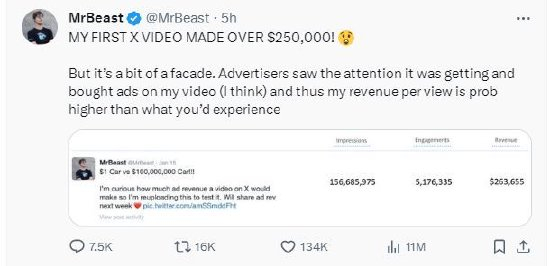 MrBeast在周一的帖子中写道:“我的第一个X视频赚了超过25万美元!但这有点像是一种假象。广告商看到了我的视频所获得的关注,并在我的视频上购买了广告(我认为),因此我的每次观看收入可能比你体验到的要高。”