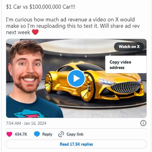 这条视频在一周内吸引了超过1.5亿的浏览量。MrBeast最初是在去年9月把这段视频上传到YouTube上的,他上周表示“我很好奇X上的视频能带来多少广告收入,所以我重新上传了这个来测试一下。”