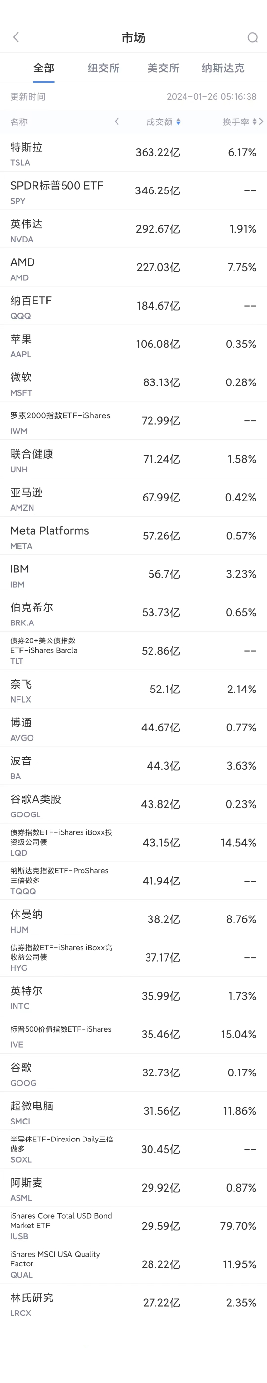 1月25日美股成交额前20:特斯拉财报欠佳股价重挫12%