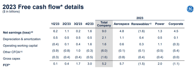 根据通用电气2023年第4季度盈利的一部分发布的现金流摘要,通用电气2023年产生了52亿美元的自由现金流,同比增长率为68%。航空航天部门在2023年贡献了57亿美元的自由现金流,但被重组可再生能源部门15亿美元的自由现金流损失所抵消。