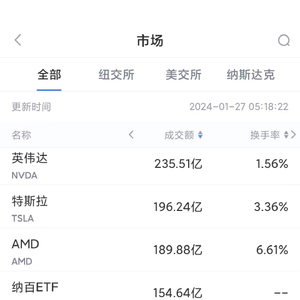 第3名AMD收跌1.71%,成交189.88亿美元。AMD股价周四创历史新高,本月迄今已经上涨超过20%。该公司将下周二(1月30日)公布第四财季业绩。