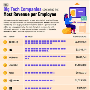 其中,Netflix员工的人均创收达到了249万美元,高居榜首。苹果和Meta员工的人均创收也相当可观,分别为234.8万美元和163万美元,仅次于Netflix。虽然Netflix、苹果和Meta在视频流媒体、消费电子产品和社交媒体等不同领域开展业务,但都有能力通过精简和高效的员工队伍实现收入最大化。