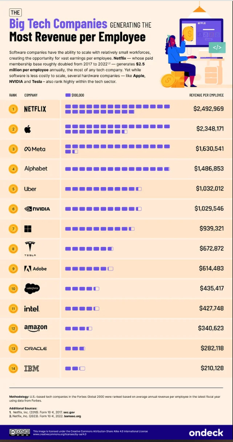 根据Ondeck公布的报告,目前,全球员工人均创收最高的8家科技公司是Netflix(奈飞)、苹果、Meta、Alphabet、Uber、Nvidia、微软和特斯拉。