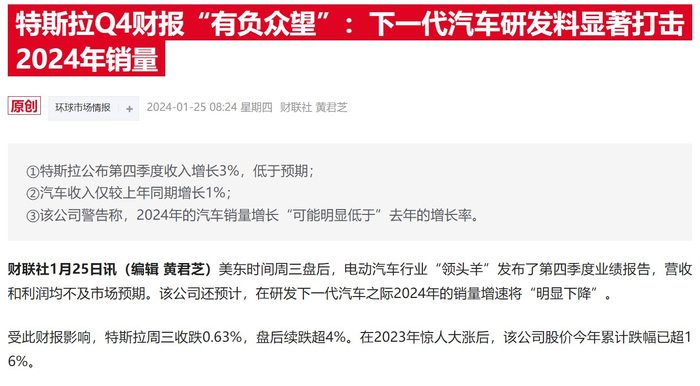 先补充一点背景知识。在上周特斯拉发布的四季报中,营收215.6亿美元,低于预期;调整后每股收益,低于预期;毛利率17.6%,还是低于预期。