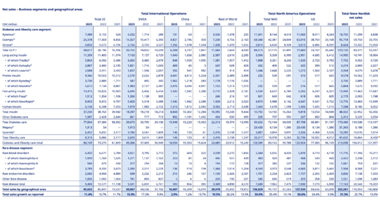 按业务来看,糖尿病和肥胖护理业务收入2150.98亿丹麦克朗(312.75亿美元),同比增长38%。其中GLP-1类糖尿病产品收入1231.32亿丹麦克朗(179.03亿美)同比大涨48%,肥胖症药物收入416.32亿丹麦克朗(60.53亿美元)同比大涨147%,罕见病药物收入171.63亿丹麦克朗(24.96亿美元)同比下滑16%。