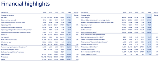 公告中还提到,在2024年3月21日举行的年度股东大会上,董事会将提议派发2023年每股6.40丹麦克朗的末期股息。 预计2023年股息总额为每股9.40丹麦克朗,其中3.00丹麦克朗已于2023年8月作为中期股息支付。董事会决定,将启动高达200亿丹麦克朗的新股回购计划。