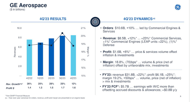 通用电气(NYSE:GE)近期发布了第四季度财报。总体而言,通用电气的第四季度财报显示出强劲的收入和订单增长、盈利能力的提高以及去杠杆化目标的进展。所有业务部门,包括航空航天、电力、可再生能源和医疗保健,都实现了健康的有机收入增长。该公司对2024年的前景也很乐观,表明其扭亏为盈的努力将继续保持势头。
