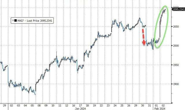 摩根大通和美国银行等大行均发出了警报:他们将当今大型科技公司的集中度与二十年前的互联网泡沫进行了比较,并表示它们的增长速度可能不可持续——Mag-7在2023里上涨了80%,而标普500的个股平均涨幅仅为3%。