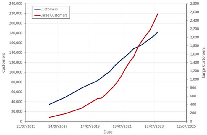 尽管出现了销售问题,Cloudflare 的客户获取仍然保持健康,其中大客户的增长尤其强劲。例如,年支出超过 10 万美元的 Cloudflare 客户数量同比增长 34%。