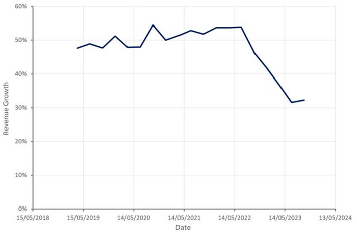 然而,对于人工智能支持下软件增长的广泛加速预期可能过于乐观。总体上,软件估值似乎过高,尤其是相对于当前的高利率而言。Cloudflare 由于其溢价估值而尤其面临较高的风险。如果像 Cloudflare 这样的公司想要证明在任何时间长度内 20-30 倍范围内的收入倍数是合理的,他们将需要在当前水平上实现大幅加速增长。