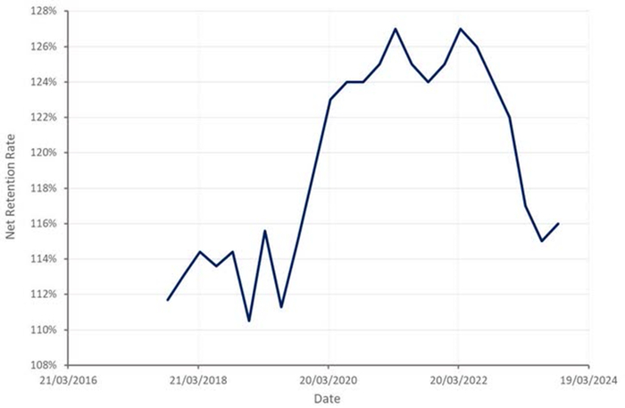 尽管如此,Cloudflare 按美元计算的净保留率仍然很低,第三季度为 116%。这是一个滞后指标,未来应该会继续增加。这一点很重要,因为 Cloudflare 的增长放缓似乎很大程度上是由于其现有客户群的扩张速度放缓。
