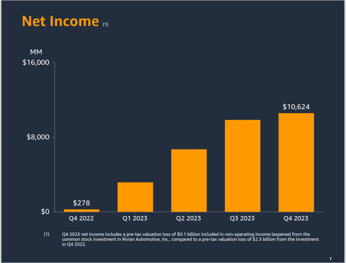财报显示,亚马逊2023年营收为5748亿美元,同比增长12%,净利润为304亿美元,成功扭转了2022年净亏损27亿美元的颓势。其中,Q4净利润为106.2亿美元,去年同期仅为2.8亿美元。