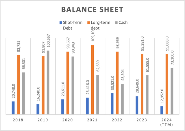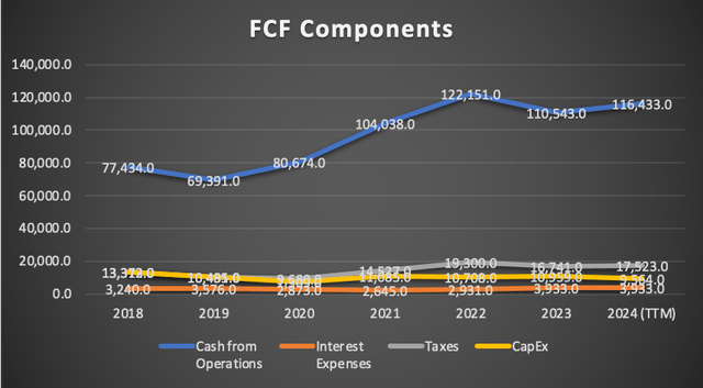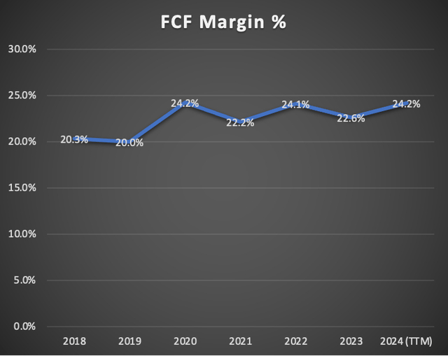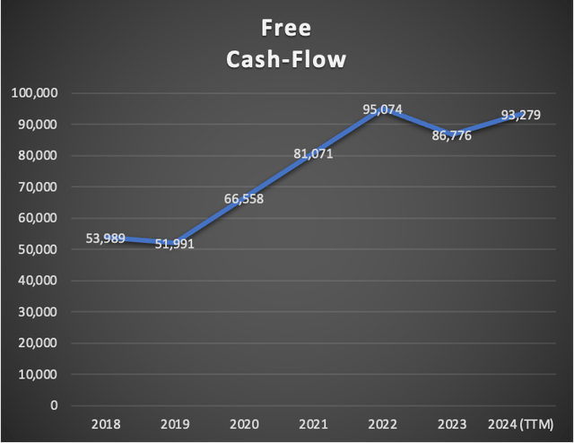 此外,自由现金流有所改善。目前,该公司的自由现金流为932.7亿美元。FCF利润率增加到24.2%。这一改善归因于运营现金(1164.3亿美元)的增加,以及资本支出(95.6亿美元)的减少。