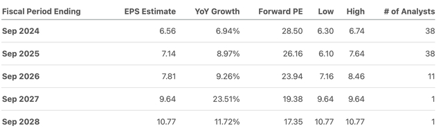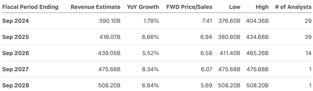 营收预期则没有反映出如此高的增长率。整个2028年,营收预计将以中个位数的速度增长,唯一的例外是2027年,预计营收将增长8.34%。
