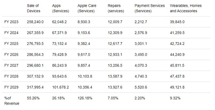 而如果以苹果产品所属细分市场的可用市场趋势为基础,即设备的销售额预计将以3.53%的速度增长,应用程序的销售额将增长8.58%,维修和AppleCare的销售额将增长2.5%,苹果支付服务的销售额将增长16.46%,配件的销售额将与设备的销售额一样增长3.5%,可以得出更加乐观的结果。