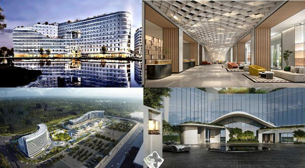 从左至右顺时针:上海静安寺智选假日酒店、深圳福田中心智选假日酒店、连云港海州湾voco酒店、连云港海州湾之星voco酒店