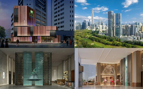 从左至右顺时针:上海虹桥商务区voco套房酒店及上海虹桥商务区逸衡酒店、上海浦东机场假日酒店、深圳宝安京基华邑酒店、贵阳机场假日酒店
