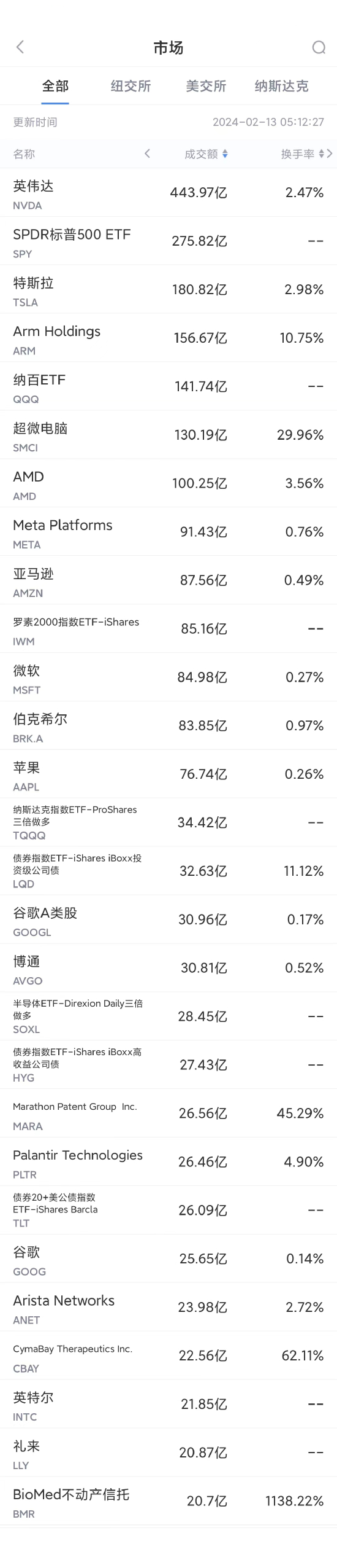 第4名超微电脑收高4.42%,再创历史新高,成交130.19亿美元。2024年迄今,超微电脑公司的股价已经上涨超过170%,归功于市场对该公司服务器的强劲需求,而服务器是运行人工智能应用程序的芯片的基础设施。