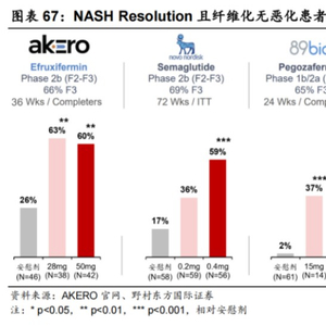 根据III期试验MAESTRO-NASH结果显示:1)与安慰剂组相比(10%),在接受80mg和100mg Resmetirom治疗52周的患者中,分别有26%和30%的患者实现NASH症状缓解;2)与安慰剂组相比(14%),在接受80mg和100mg Resmetirom治疗52周的患者中,分别有24%和26%的患者实现至少一个阶段的纤维化改善,且NAS评分无恶化。