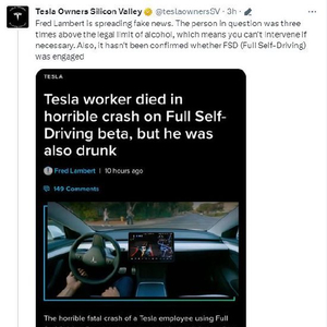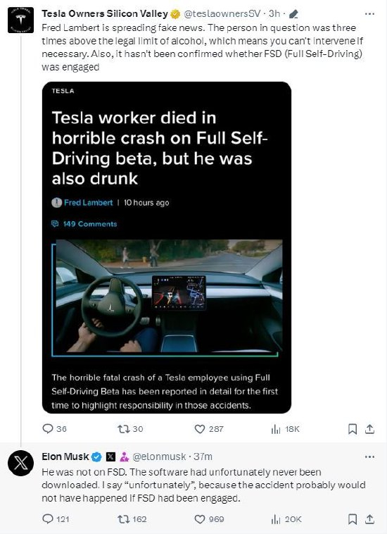 特斯拉CEO埃隆·马斯克对有关该公司一名员工在一起涉及FSD软件的车祸中丧生的报道进行了回应,称这辆车根本没有下载FSD软件,并认为这是一个遗憾,因为如果安装了FSD的话,可能会挽救这位喝醉了酒的车主的生命。