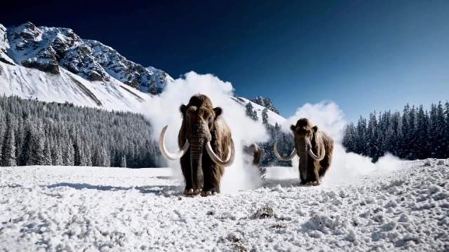 几只巨大的毛茸茸的猛犸象在白雪覆盖的草地上走近,它们长长的毛茸茸的皮毛在风中轻轻飘动,远处是白雪覆盖的树木和山脉。下午三点左右的光线,远处的一缕云彩和高处的太阳,创造了温暖的光芒。