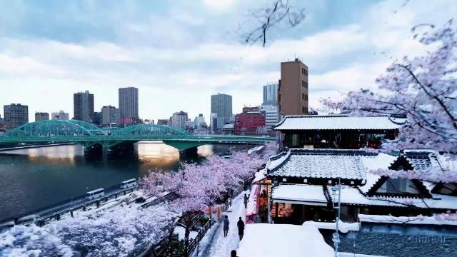 美丽、白雪皑皑的东京市热闹非凡。镜头穿过熙熙攘攘的城市街道,跟踪几个人享受美丽的下雪天气,并在附近的摊位购物。绚丽的樱花花瓣和雪花随风飘扬。