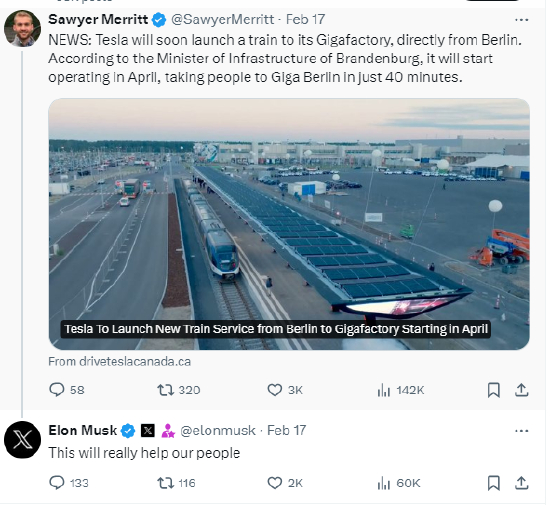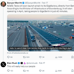 周末有报道称,特斯拉很快将推出一趟列车,直接从柏林前往其超级工厂。根据勃兰登堡州基础设施部长的说法,这条铁路将于4月开始运营,从柏林到特斯拉超级工厂只需40分钟。