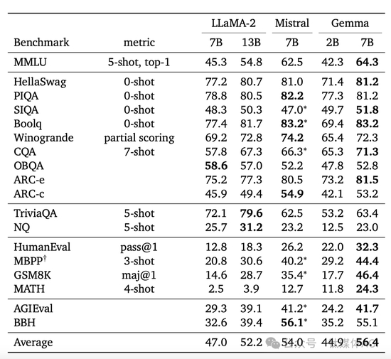 平均分数方面,Gemma -7B 的基准测试平均分高达56.4,远超过Llama-13B(52.2)、Mistral-7B(54.0),成为目前全球最强大的开源模型。