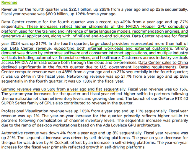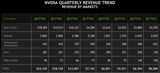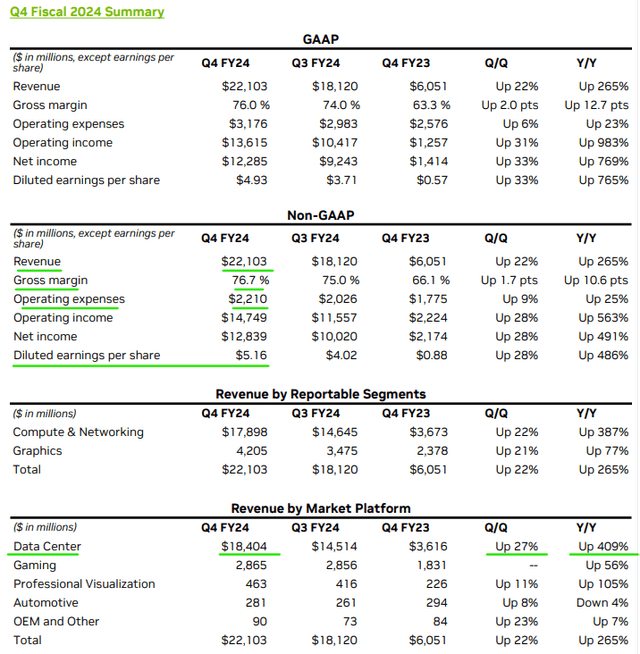 2024财年第四季度,英伟达(NASDAQ:NVDA)的营收和利润飙升超出预期,收入和非GAAP每股收益分别为$221亿和$5.16。与前几个季度一样,英伟达的出色表现主要是由其数据中心部门推动的,该部门目前正经历着对英伟达的AI GPU芯片的无限生成性AI需求: