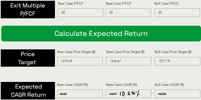 假设基本情况退出倍数为25倍P/FCF,可以看到英伟达到2029年将上涨至每股1,326美元。这一价格目标意味着6年预期复合年增长率在当前水平上为10.68%。