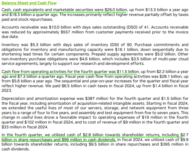 2024财年第四季度,英伟达的季度自由现金流在2023年第四季度跃升至+$112亿。尽管英伟达在第四季度通过回购和股息向股东返还$28亿,但这家半导体巨头堡垒般的资产负债表不断变得更强,现金和短期投资头寸升至$260亿。