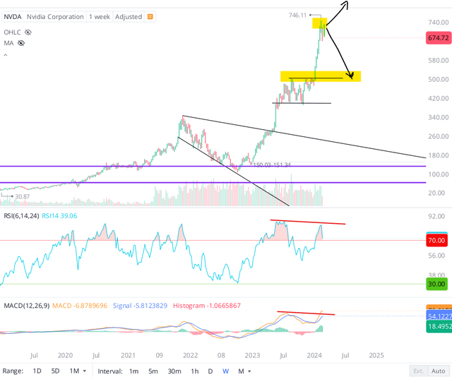 从技术上讲,英伟达的股票牢牢处于超买区域(RSI>70)。虽然知道股票可能会长期处于超买状态,而且这种势头可以将英伟达推向难以想象的水平,但价格和动量指标(RSI和MACD)之间的差异令人担忧。