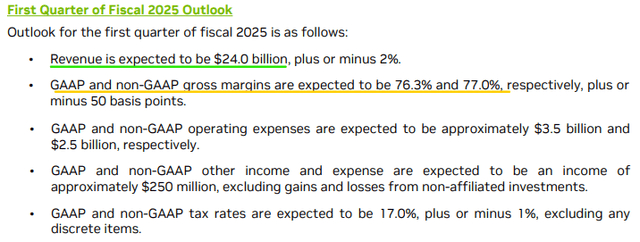 对于2025财年第一季度,英伟达管理层预计收入为240亿美元(而市场估计为220亿美元),这意味着下季度将继续实现天文数字增长。也就是说,英伟达的利润率扩张预计将放缓,第一季度的非GAAP营业利润率预计将升至77%(比上一季度增长30个基点)。