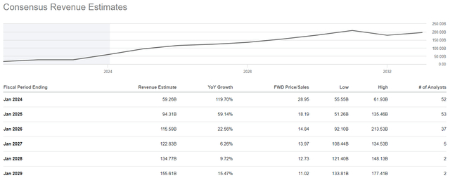 鉴于2025财年的又一个井喷季度和管理层的积极评论,英伟达公司有望可以在未来12个月内实现$1000亿的收入。鉴于近期销售增长的大幅跃升,我们将根据远期收入估计构建模型,然后对模型的公允价值输出进行贴现,以获得当前的公允价值估计。