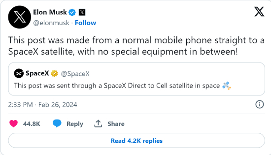 SpaceX工程师、卫星到蜂窝技术负责人Ben Longmier对此给予了证实,称这是该团队第一次通过卫星在X上发布信息。