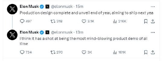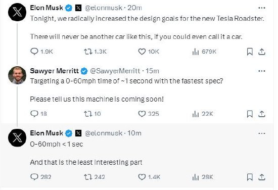 马斯克发帖称:“特斯拉新一代Roadster跑车的生产设计已完成,并在年底推出,目标是明年发货。我认为它有可能成为有史以来最令人兴奋的产品演示。”