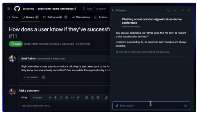 GitHub Copilot Enterprise 直接将类ChatGPT聊天功能集成到 GitHub.com,使开发人员能够通过自然语言提问各种有关代码的问题。