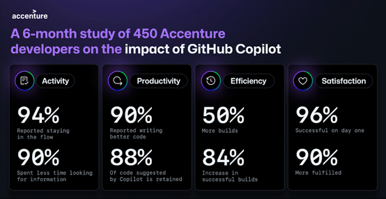 根据埃森哲的调查数据显示,94%的开发人员表示,使用 GitHub Copilot 有助于他们减少在重复性编码任务上花费的精力;90%的开发人员花在搜索信息上的时间更少。