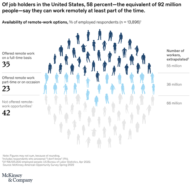 世界经济论坛的一篇文章阐明了麦肯锡公司发布的一项研究表明,到2022年,近十分之六的美国人有机会每周至少一天在家工作。