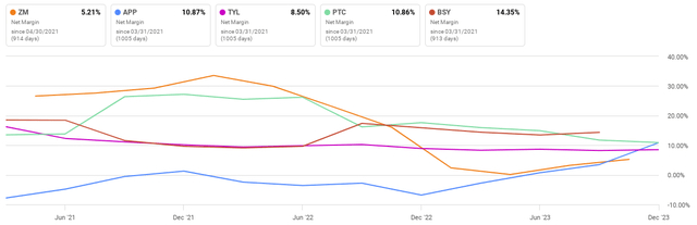Zoom的净利润率为5.21%,与行业中位数2.52%相差107.08%。然而,与其他一些与Zoom市值相似的信息技术公司相比,它的净利润率实际上相当低: