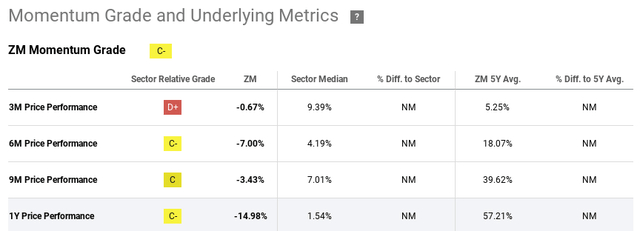 此外,Zoom的发展势头明显较低,在3M、6M、9M和1Y基础上的表现明显低于行业中位数。这可能意味着,如果投资者此时购买股票,那么在中短期内,在股票再次升值之前可能会出现一些负回报。