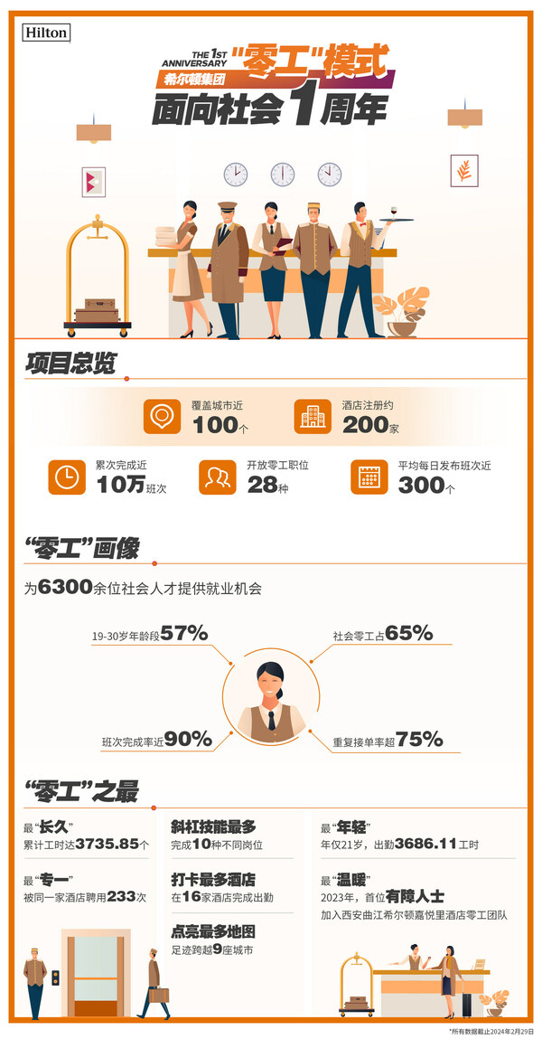 上海2024年3月1日 /美通社/ -- 作为国内首家引入"零工"模式的国际酒店集团,希尔顿集团大中华区自2023年3月1日面向社会推出"零工"模式以来,已将这一项目从2个试点城市拓展至近100个城市,覆盖约200家酒店。因提升运营效率、降低人力资源成本等助益,"零工"模式迅速在希尔顿集团旗下酒店得到推广,并吸引了六千余位社会人才参与,推出至今累计完成"零工"班次近10万个。下阶段,希尔顿集团将继续秉承创新精神拓展"零工"模式,覆盖更多城市、更多样化的人群;同时,将阶梯式设计"零工"职位,开放更多高时薪"零工"职位,方便"零工"参与者制定纵向的职业发展计划。