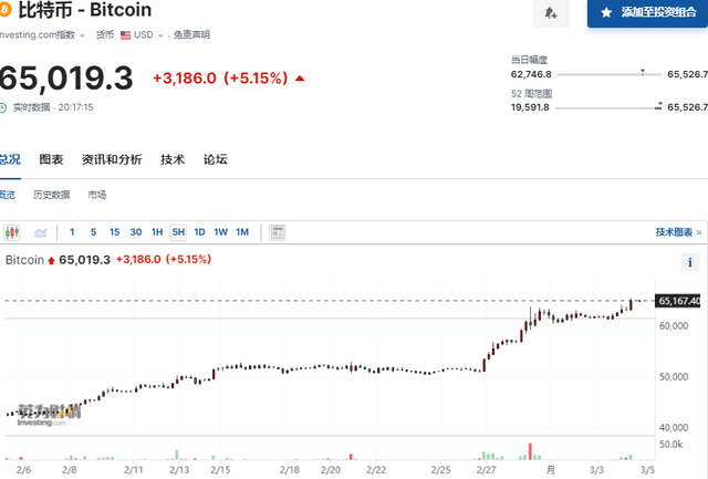 周一,比特币日内涨超5%突破6.5万美元,创2021年11月以来新高,距离历史高点不到4000美元,在过去一周里大涨约50%。