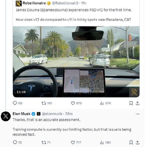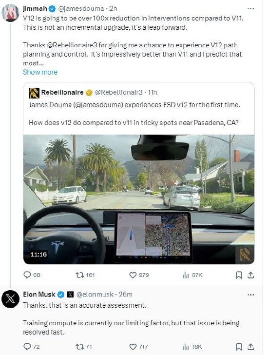 一位X用户发帖称:“与V11相比,V12的干预次数将减少100倍以上。这不是一次渐进式升级,而是一次飞跃。