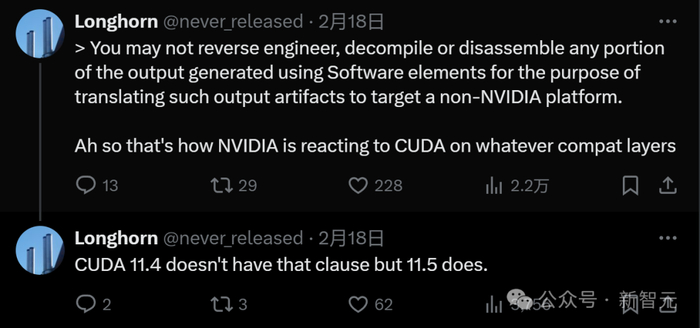 2月18号,软件工程师Longhorn在推上表示自己发现了CUDA新增的条款: