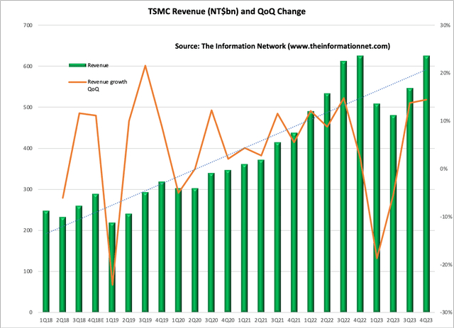 图1显示了台积电2018年第一季度至2023年第四季度的季度总收入(十亿新台币),以及环比收入增长。