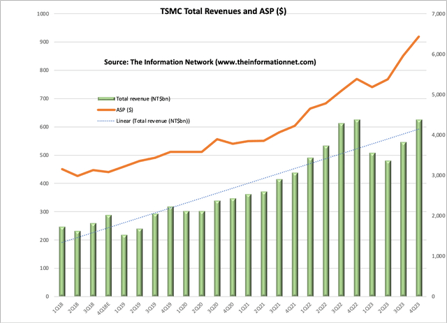 台积电原计划在2023年中期提高芯片价格,但芯片市场及其收入的放缓迫使该公司放弃了这一计划。图6显示了台积电2018年第一季度至2023年第四季度的收入和平均售价。