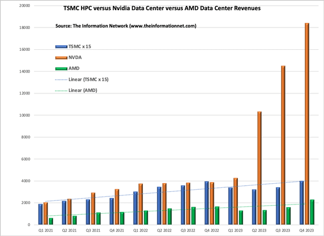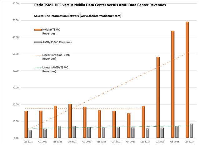 我在图4中以图形形式显示了英伟达/TSMC收入(橙色条)和AMD/TSMC收入(灰色条)的比率。这些是英伟达和AMD的实际数据中心收入,以及台积电的HPC收入。