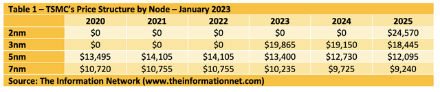 表1显示了台积电截至2023年1月的价格结构,根据信息网络的报告《全球半导体设备:市场、市场份额和市场预测》。