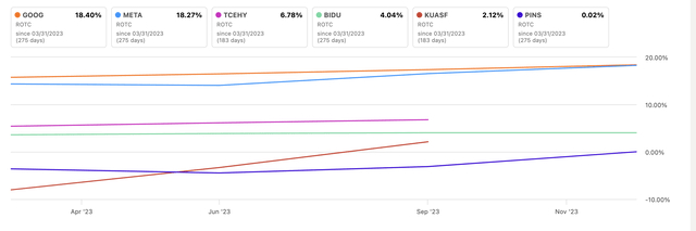 与同行相比,就竞争优势而言,谷歌在总资本回报率(ROTC)方面处于领先地位,Meta紧随其后,而其他平台则相差甚远。该公司享有相当大的竞争优势,并且拥有强大的护城河,当你有一个以搜索引擎命名的动词时,这一点就很明显了。